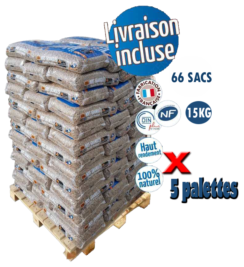 | Titre | 5 Palettes – Woodstock – 66 Sacs de 15 KG – Granulés de bois premium |
